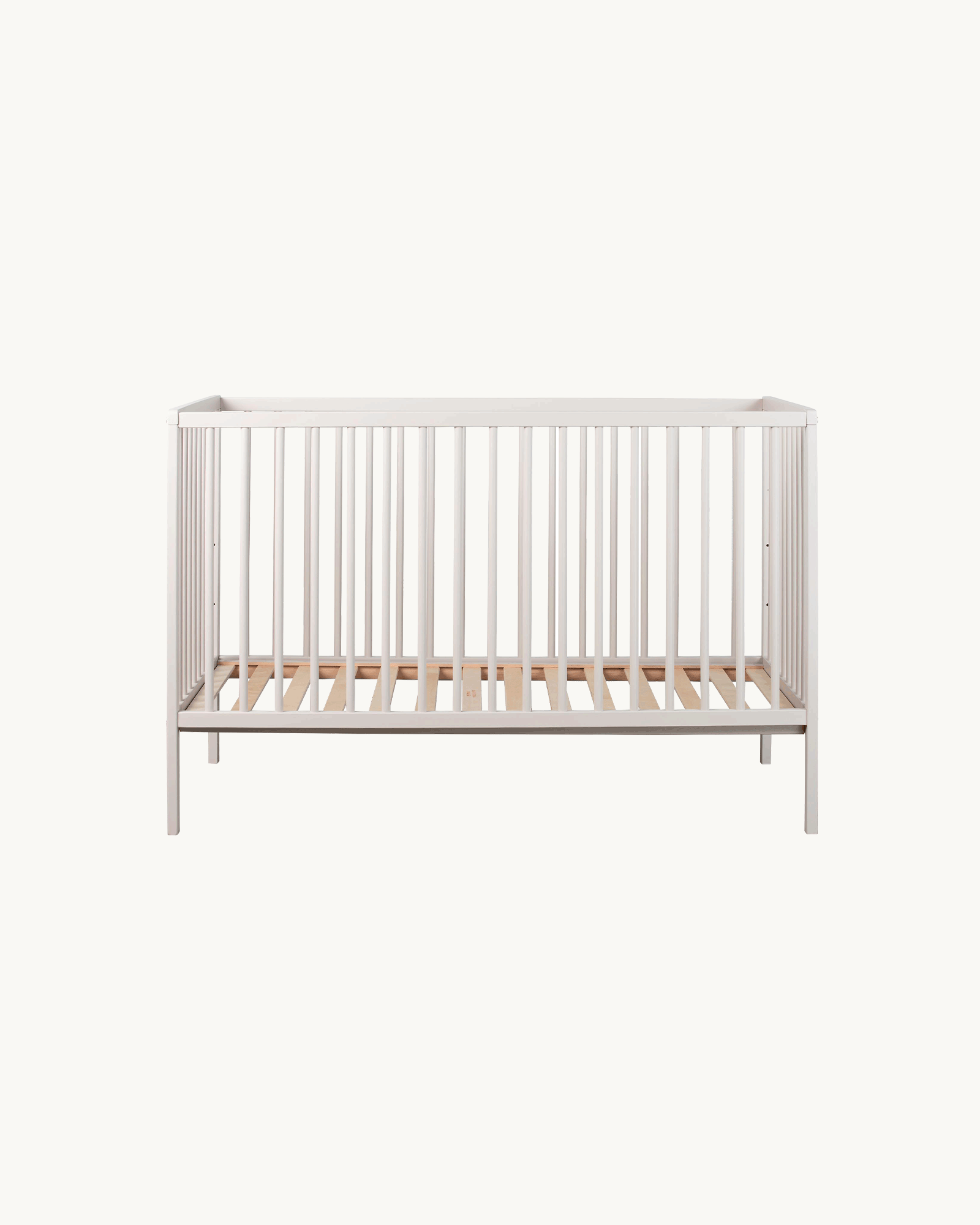 A beautiful baby crib made from solid beech in the colour clay, which has a light grey look. This crib features an adjustable height bottom with three positions (30 cm, 45 cm, and 60 cm), allowing you to customize it to the needs of your growing child.