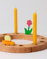 These brass candle holders secure candles safely in the Celebration Ring, also from Grimm's.