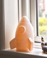 The Spaceship Lamp is made of vinyl, which does not heat up. It is therefore safe to leave the lamp lit during the night, for all those little ones who need a bit of added security while drifting off to sleep.