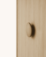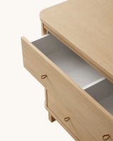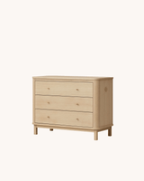 The Wood Mini Dresser with 3 drawers is made of MDF veneered in oak. The footing and hooks, as well as the side panels of the nursery top, are made of white-oiled solid oak. The inside of the drawers is made of white-painted MDF. Handles made from 100% full-grain leather.