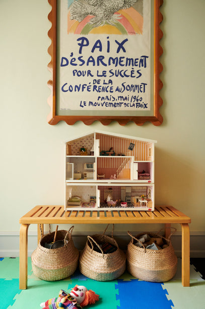 A doll house is placed on the Alvar Aalto bench in perfect height for Barbara to play. Baskets with toys are placed under the bench, also within reach.