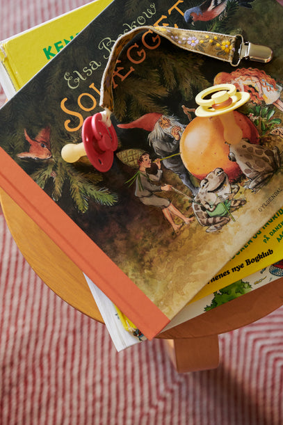 Also here; a few pacifiers and a handmade pacifier clip, made from vintage ribbon found in Rome.