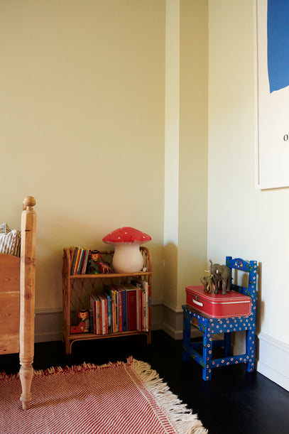 Barbara's books are stored in this cute little shelf that is placed in one corner of the room. On the shelf is a large mushroom lamp used during the day and especially at night time.