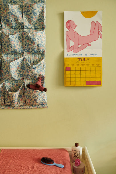 The beauty of contrast: A David Shrigley calendar hangs next to a storage net made from Liberty fabrics.