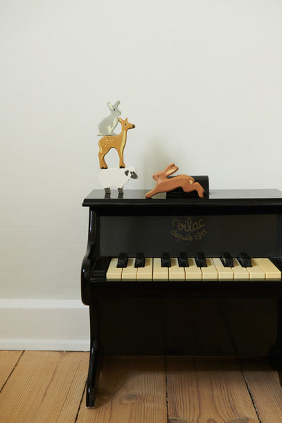 Wooden animals are balancing on a vintage black piano from Vilac. All walls are painted with paint colour 'Pearl' from Jotun.