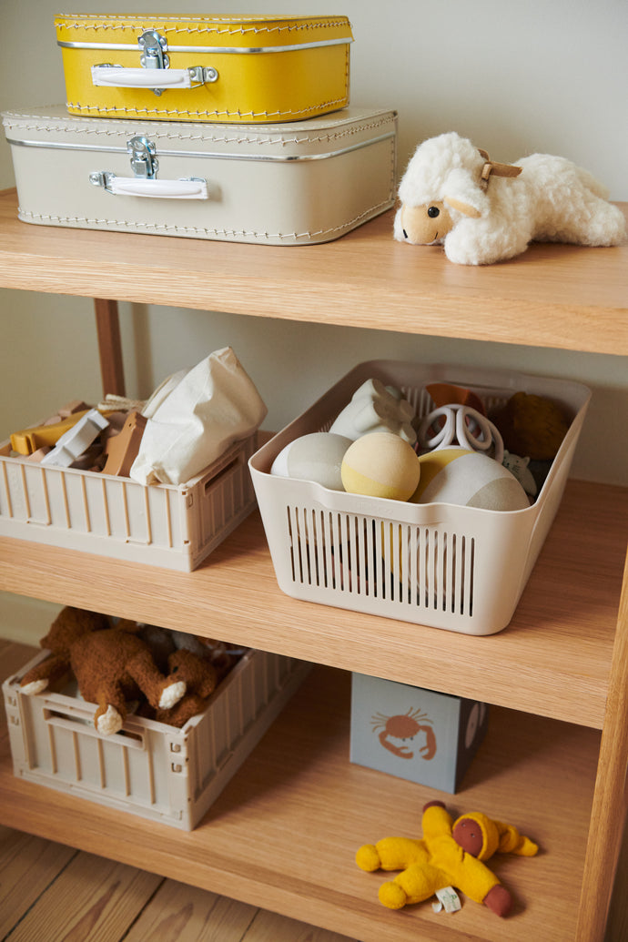 Seen here: A little yellow suitcase is placed on top of a large sand suitcase. Storage boxes are from Liewood. A yellow Nanchen Pimpel Doll lies on the lower shelf.
