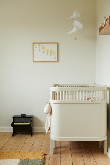 Ellis' little teddies are ready for bedtime cuddles. From the ceiling hangs a beautiful mobile from Flensted Mobiles (find a similar one here), and a cute Babar Parachute poster that has been put in an oak frame and hung next to the bed.