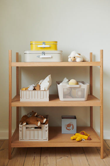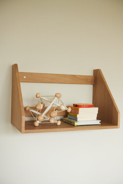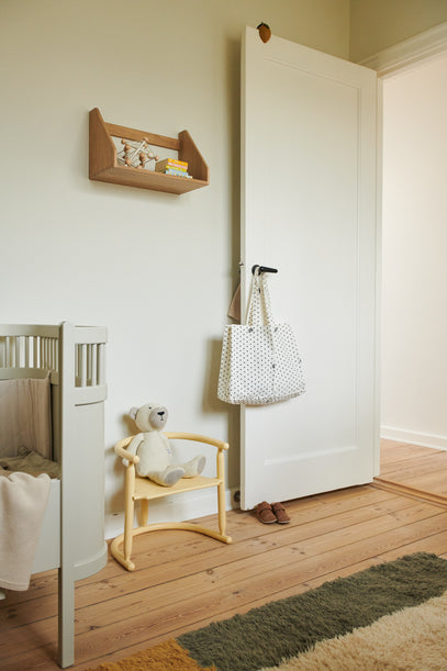 A couple of little books are stored on a Børge Mogensen shelf alongside a Skwish Rattle and a natural rubber Apple Toy to help soothe sore gums.