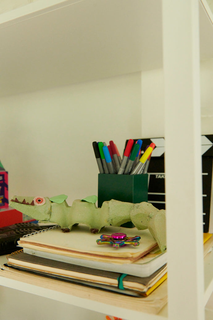 Markers from Creativ Company next to a handmade crocodile made from cardboard egg trays.