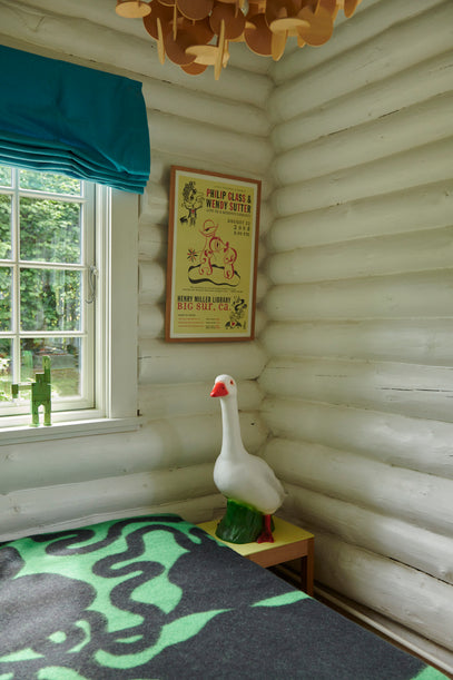 Gilbert's room is a corner room with plenty of natural light and views to the garden. The white wooden logs make the colours in here pop, but somehow the look is still surprisingly calm, and the space has a cosy, Scandinavian feel.