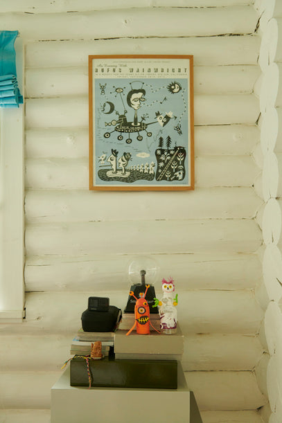 A large Goose Lamp adds a warm and cosy light a night time and is an eye catching and quirky object during the day. The lamp is placed on a Frame Stool with a yellow top, that also works as an extra seat when friends are over.