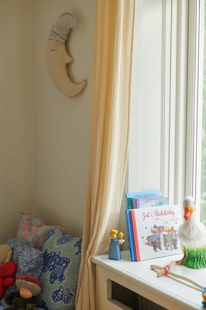 Hilma loves to spend time by her desk playing, painting and colouring. This is also where she keeps all of her colouring books and stickers. Find similar arts and crafts here. A pile of Astrid Lindgren books from Gyldendal are placed on the chair; one of them Lotte kan nemlig is a current favourite.