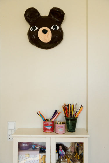 Miniature figures and animals have their place in the white hanging cabinet. Two tin cans are placed on top of the cabinet, used to store colour pencils. On the wall above hangs a papier-mâché bear.