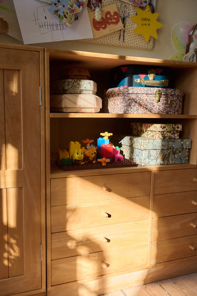 A wonderful wooden cabinet with open space and drawers is used to store more toys, Duplo and LEGO and lots of markers, paper and other creative toys.