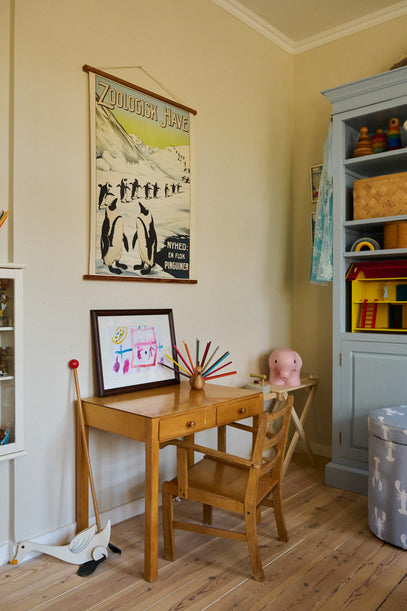 Great vintage finds include this table, matching chair and an old poster from Copenhagen Zoo. On the floor; an old duck on a stick – see our new version here.