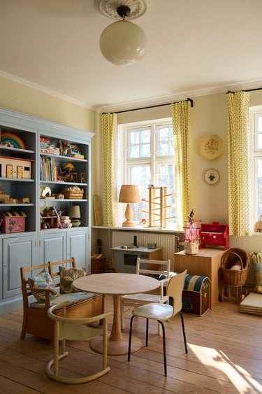 Taking inspiration from Norma and Elmers daycare, Sofie designed the playroom with zones, enabling the kids to play with different things simultaneously. Zones also help with the organisation of toys. In addition, almost everything is kept low in height – perfect for Norma and Elmer so they can reach.