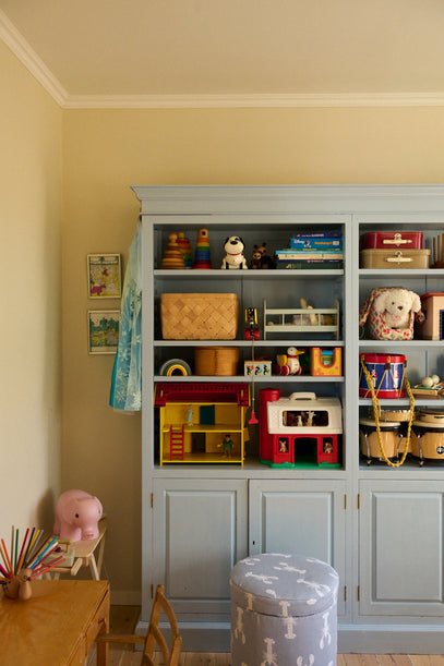 A large cabinet is used for toys, books, a silver elephant piggy bank from Georg Jensen and other collectibles.