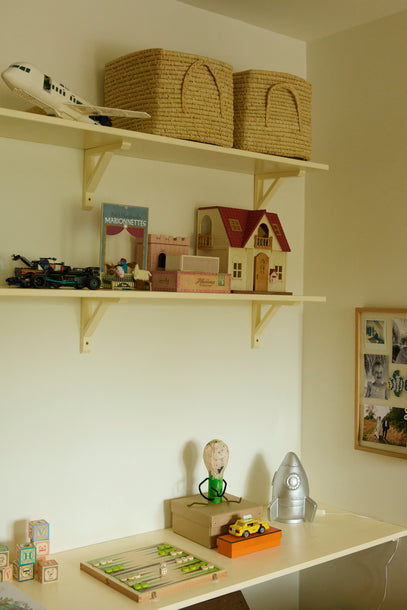 Shelvings above the table keep toys, books, and everyday items organized and easily accessible when needed. Two open raffia baskets are used for storage – see other colours here. A spaceship lamp is placed on the table; alongside creative projects and a game of backgammon.