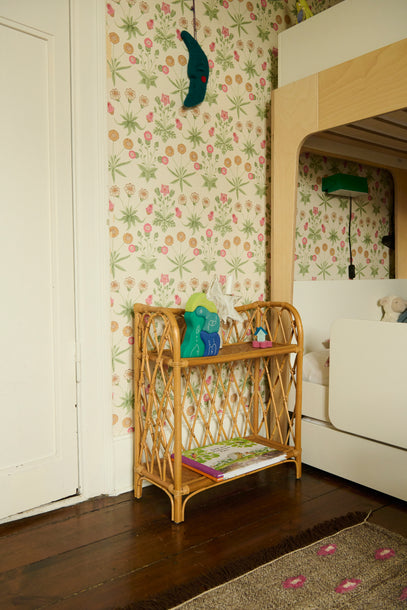 A rattan shelf is placed next to the bunk bed, and works as a small bed side table. Books for night time lie here – Rose & Villy get to choose 1-2 books each night before bedtime.
