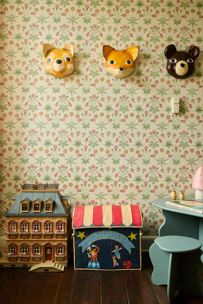 The green table and chair set and the pink mushroom lamp match the beautiful wallpaper from William Morris.