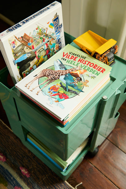 More books, including 'Vilde Historier fra hele verden' and 'Den Fantastiske Bus' are stored on and inside the Boby Trolley designed by Joe Colombo.