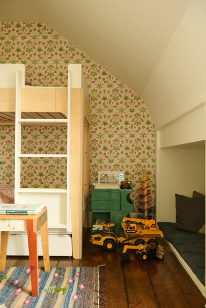 The Perch bunk bed was added just recently, and has made a huge difference to the room: It gives each child their own little space in the shared space, plus has freed up space to play on the floor.