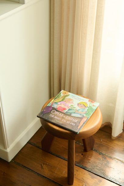 Books everywhere in the house. Here, 'Omar & Dagmar får noget til at gro' on a beautiful wooden stool, designed by Charlotte Perriand.