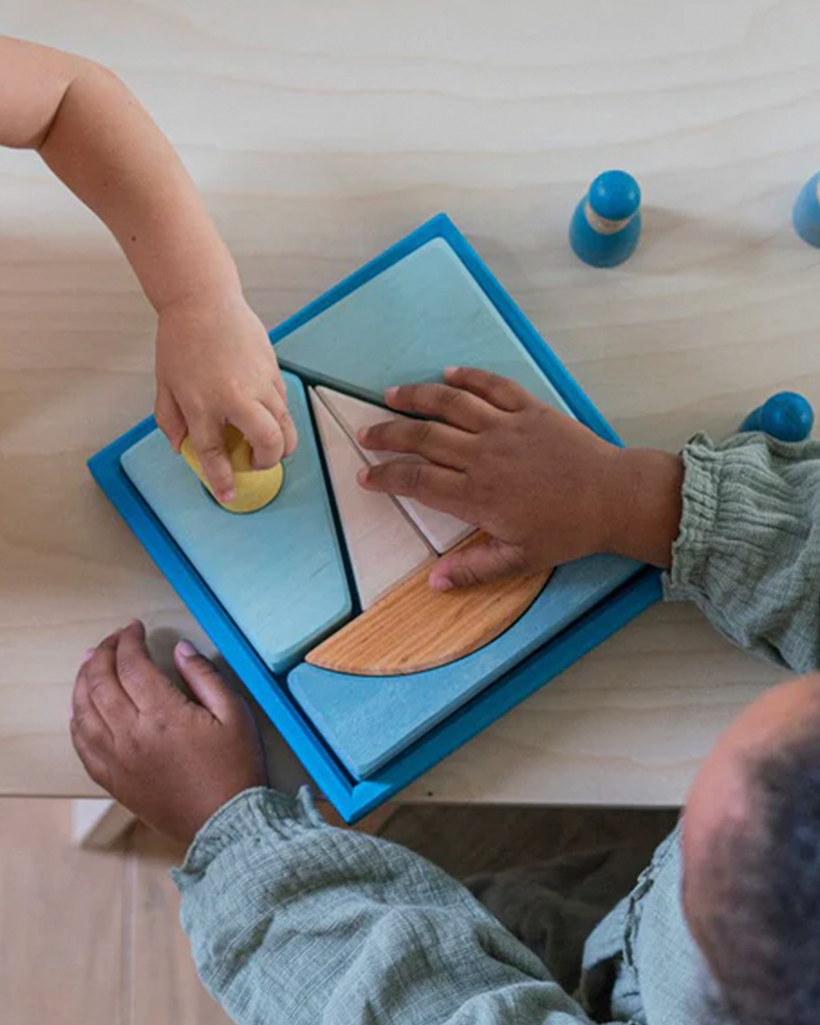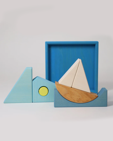 A beautiful building set/puzzle in shades of blue from German brand Grimm's. This set may be used both as a puzzle and as a building set with endless possibilities.