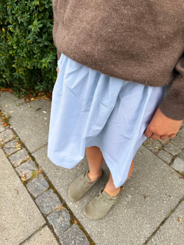 A lovely, knee-length skirt in a delicate checkered blue print.