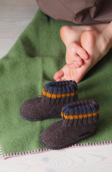 The Wool Shoe is a wonderful indoor shoe that comes with a sock-like top, that keeps your child warm and comfortable. The "sock" ensures that the shoe stays on the foot, but it is fully bendable and flexible and with no hard edges that may rub into the lower ankle as your child bends or sits downs.