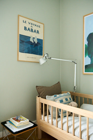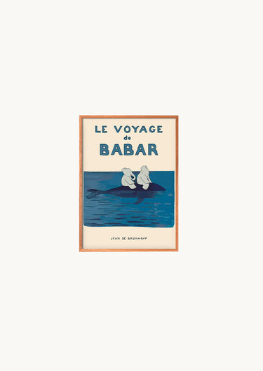 This wonderful print in blue and cream tones features Babar on a whale, swimming in the ocean. A lovely poster for the nursery or the kid's room.