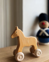 Willy is a beautiful, handcrafted wooden horse on wheels.