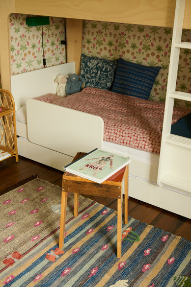 The Perch Bunk Bed meets all European safety standards. It’s built from solid birch and Baltic birch plywood, and has a sturdy frame and solid rails on top. It is lower than most conventional bunk beds, making access for kids safer, and good-night-kisses for adults easier. The bunk fits mattresses sized 90 x 200 cm available for purchase here. The ladder may be securely attached on either side of the bed, depending on the layout of the room.