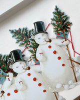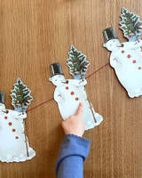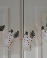 A beautiful and cosy garland featuring ten repeated motifs of a snowman with a Christmas tree.