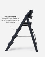 The ladder allows your child to climb up and down the chair on his/her own. At the same time, your child gets an ergonomic and comfortable posture from being able to sit by themselves (with safety rail at about 6-8 months of age) and up to the age of 6-8 years. The legs rest naturally at the different steps as they grow.