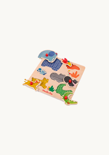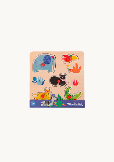 A lovely wooden puzzle with 5 large pieces with fun and colourful illustrations, that help your baby understand shapes and colours.