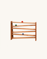 A beautiful, handmade wooden ball track that comes with 3 wooden marbles in green, blue and red, and a bell that rings once the balls hit it when reaching the final bar.
