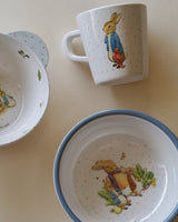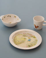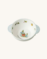 A practical melamine bowl that is beautifully decorated with illustrations of Peter the Rabbit.