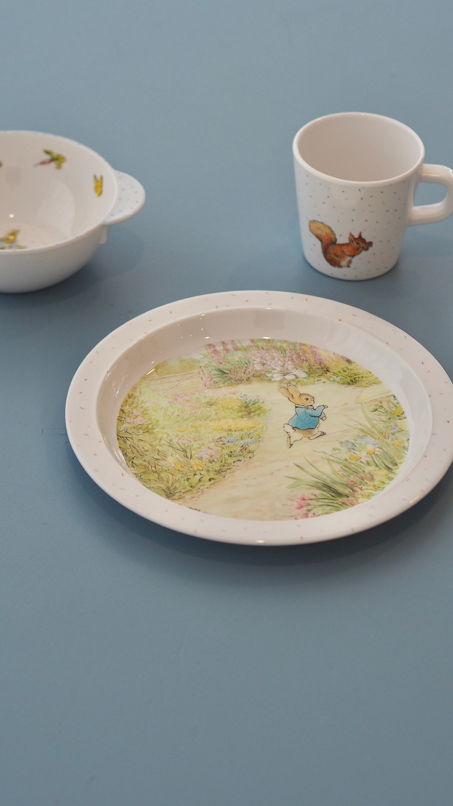 A beautiful melamine plate that is beautifully decorated with illustrations of Peter the Rabbit.