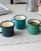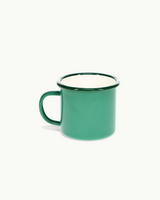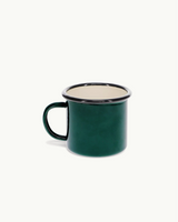 A cute little enamel cup with a handle. Perfect for hot chocolate in the forest or hot tea in the garden at home.